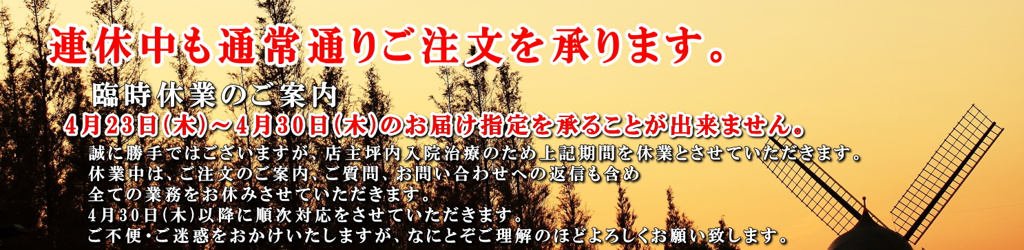 ※休業日でもネットでのご注文・メールでのお問い合わせは24時間お受けしております。尚、お返事は翌営業日に順次対応させて頂きます。
