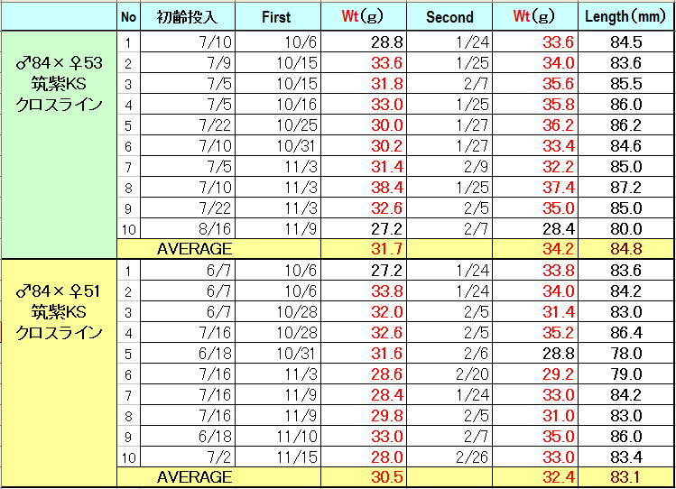 今期の筑紫KS種親の組み合わせは、血統背景の最もよい84ミリのオスと、幼虫最終体重が同じで細長く53ミリで羽化したメス、および太めの51ミリで羽化したメスを使い、羽化した成虫体長に差が出るかを検証しました。