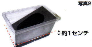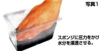 飼育ケースを使用し、ケースの底に約1cm弱程度の水を入れ、ウレタンスポンジに水分を十分浸透させます。 *写真1