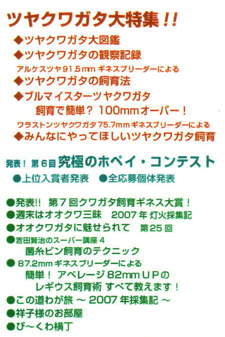 巻頭特集以外には、恒例となった『究極のホペイ・コンテスト』をはじめ、読者投票による第7回 飼育ギネス大賞の発表、ギネスブリーダーによるレギウスオオツヤクワガタの飼育、編集Tによる2007年クワガタ採集紀行など、いつものとおりに安心して買える本に仕上がっております。