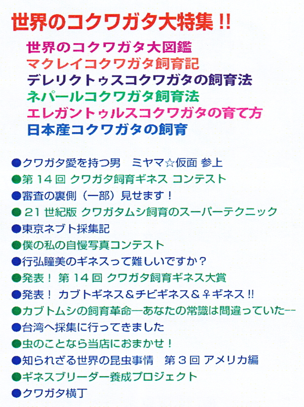 巻頭特集に合わせて、コクワガタ関連の飼育記事も5本(マクレイ、デレリクトゥス、ネパール、エレガントゥルス、日本産コクワガタ)集めました。