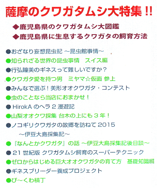 巻頭特集に合わせて、鹿児島県のクワガタをほぼ網羅する飼育記事も同時掲載です。