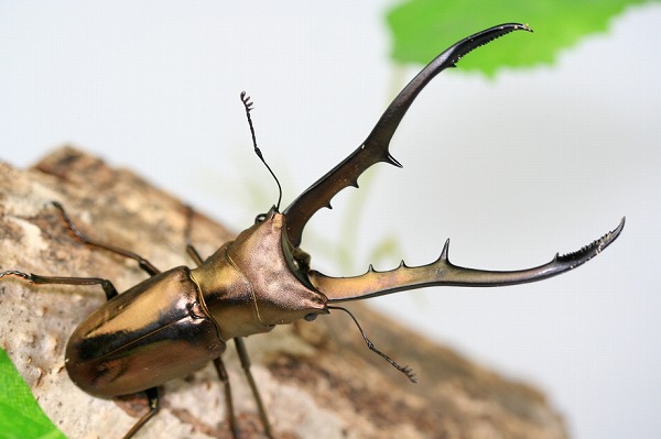 長い大アゴと、メタリックカラーが美しいクワガタです。