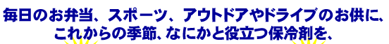 | ■暑さ対策に! 夏の暑い日のアウトドアやスポーツには欠かせない保冷剤。 ハンカチやバンダナに巻いて、頭や首を冷やすと、冷たくて気持ちいい~♪ 枕において使えば、寝苦しい夜も快適!! |