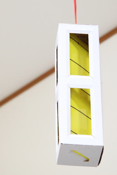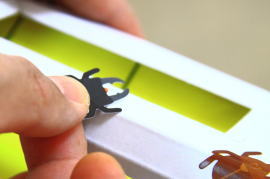 4 付属のハエとり紙の保護紙を両面とも剥がし、本体の対角線に収まるように上から挿入します。