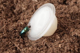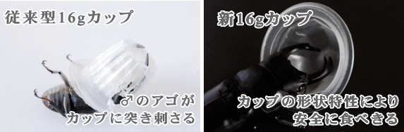 | ◇広口・丸底タイプのため、♂の大アゴが引っかからず自然に食べ進むことが出来ます。 突き刺さり難いと思われている従来型16g丸底や30gカップでも突き刺さってしまいますが、新型16gカップでは、よほどのことが無い限り突き刺さることはありません。 |