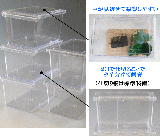 ●クワガタ・カブトムシの個体の大きさに合わせられるように取り外しの利く仕切り板付きで飼育の状況などに応じていろいろ使い分けも考えて飼育できます。