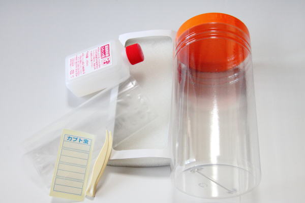 | ■内容 | 容器・特製標本台・コーティング剤・ビニール袋・ピンセット・ラベル メーカー名: フジコン *標本にする個体はついていません。 |