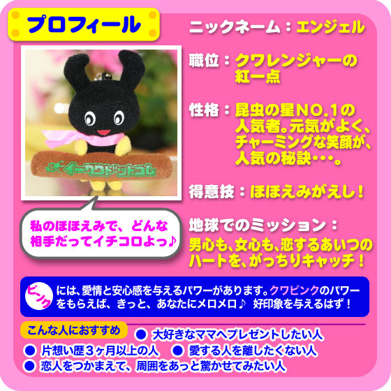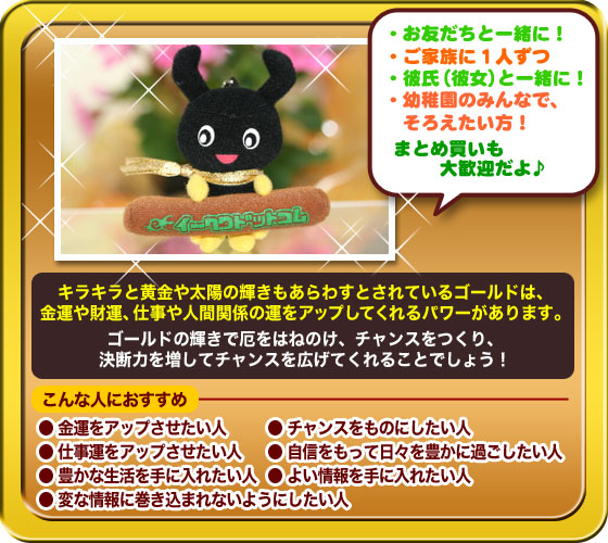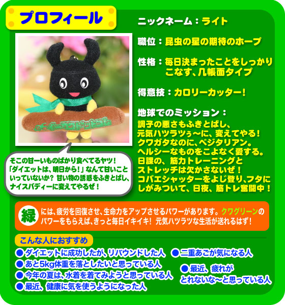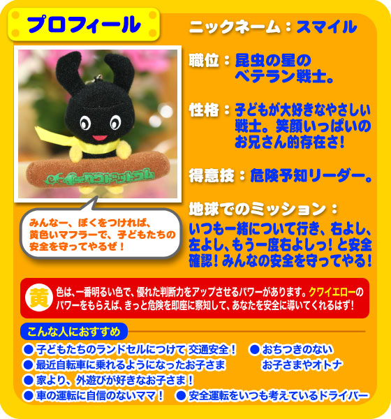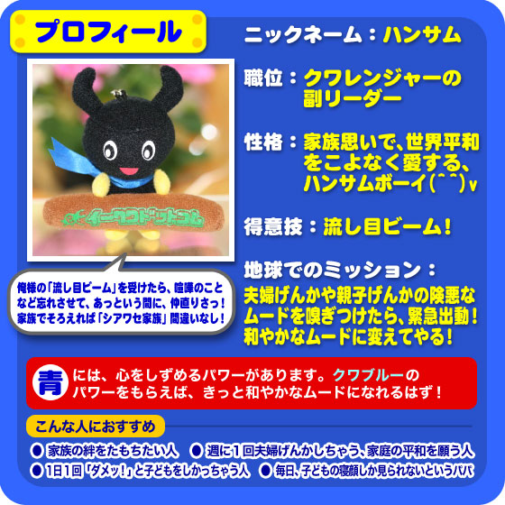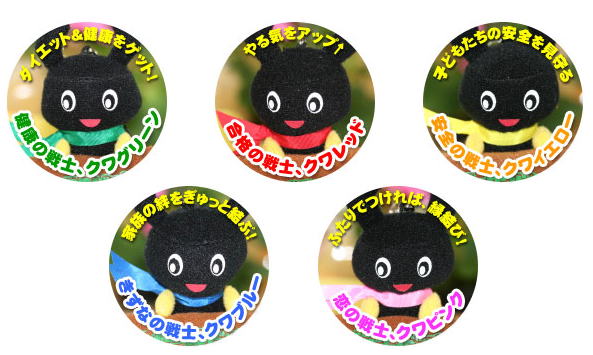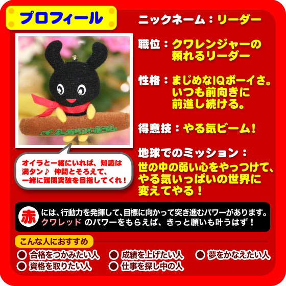 『クワッキー』 が、 ヒーローになって登場! クワレンジャーとは? 昆虫の星からやってきたクワガタのニューヒーロー! 強い大あごであなたの願いを、ぎゅっとはさんで叶える、 5頭の戦士なのです。 ![]() こんなところからも、クワガタは、 運をつかむチャンスを教えてくれるのです! 昆虫の星からやってきた、願いを叶える5頭の戦士で、 あなたなら、どんな願いをつかみたいですか? 願いを叶える5頭のニューヒーロー クワレンジャー ![]() クワッキー が 赤いパワーを身につけやってきた! やる気をアップ↑ 合格の戦士、赤のIQボーイ、クワレッド! ![]() クワッキー が 青いパワーを身につけやってきた! 家族の絆をぎゅっと結ぶ! きずなの戦士、青のハンサムボーイ、クワブルー! ![]() クワッキー が 黄色のパワーを身につけやってきた! 子どもたちの安全を見守る 安全の戦士、黄色のスマイルボーイ、クワイエロー! ![]() クワッキー が 緑のパワーを身につけやってきた! ダイエット&健康をゲット! 健康の戦士!緑のヘルシーボーイ、クワグリーン! ![]() クワッキー が ピンクのパワーを身につけやってきた! ふたりでつければ、縁結び! 恋の戦士、ピンクのエンジェル、 クワピンク! ![]() クワレンジャーを 5色そろえると、 いろいろな使いみちが・・・ ![]() そして、 クワレンジャーを 5つまとめて買うと・・・ 今なら もれなく! 金運アップ↑ クワゴールドがもらえちゃう♪ ![]() まとめ買いして、プレミアアイテム! 【クワゴールドがもらえるチャンス】は、 今だけです!! この機会をお見逃しなく!! |
