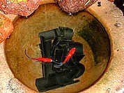 この写真は、金魚を泳がしている石臼に竹炭を入れています。