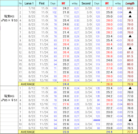 今期は、あまりたくさんの系統の試験ではなく、一昨年羽化した筑紫KS系の最大♂85ミリの個体に、同腹の♀53ミリと51ミリを掛け合わせた幼虫たち30頭です。