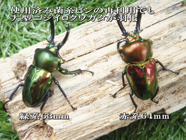 なお、3本目、4本目食いあがっていない白い部分がたくさん残っているもったいない菌糸ビンが出てしまったので、同時に飼育していたニジイロクワガタの幼虫を入れておいたところ、赤系64ミリ、緑系63ミリの大型のオスが、最後の暴れもなくきれいに羽化してくれました。