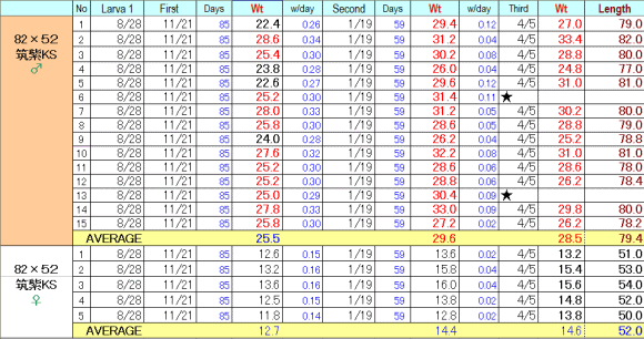 また、最近、最大個体は同系統のアウトラインから出ているとよく言われますので、同じ筑紫KS内♀でアウトラインの幼虫もとりました。これらが、タイプGでどのように成長するか、また来年報告できればと思っています。