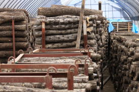 | 収穫後、ホダ木をしっかりと乾燥 | 産卵木の長さにカット |